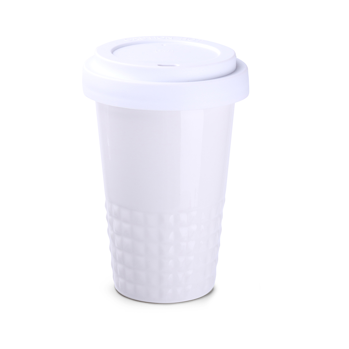 Raffiniertes Design durch symmetrisch-erhabene Form im unteren Bereich des Bechers. Doppelwandiges Porzellan mit perfekter Isolationsfunktion und dicht abschließendem Deckel.